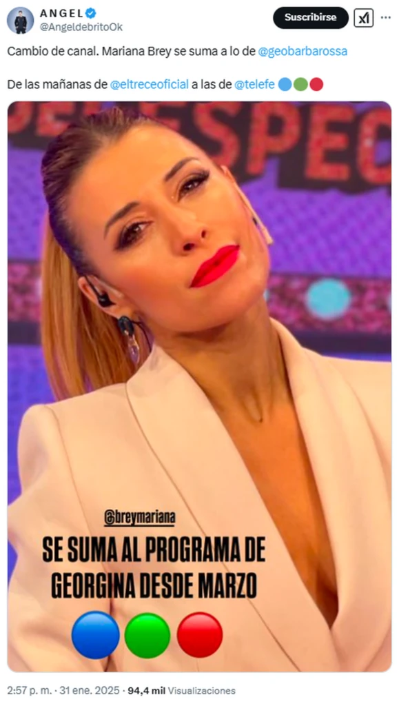 "Cambio de canal. Mariana Brey se suma a lo de Georgina Barbarossa. De las mañanas de El Trece a las de Telefe", escribió el conductor de LAM en sus redes sociales.