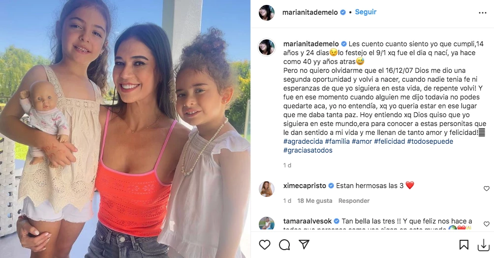 “Les cuento que siento que yo cumplí 14 años y 24 días. Lo festejo el 9 porque es el día que nací, ya hace 40 años atrás. Pero no quiero olvidarme de que el 16-12-07, Dios me dio una segunda oportunidad y volví a nacer”, compartió De Melo desde su cuenta de Instagram.