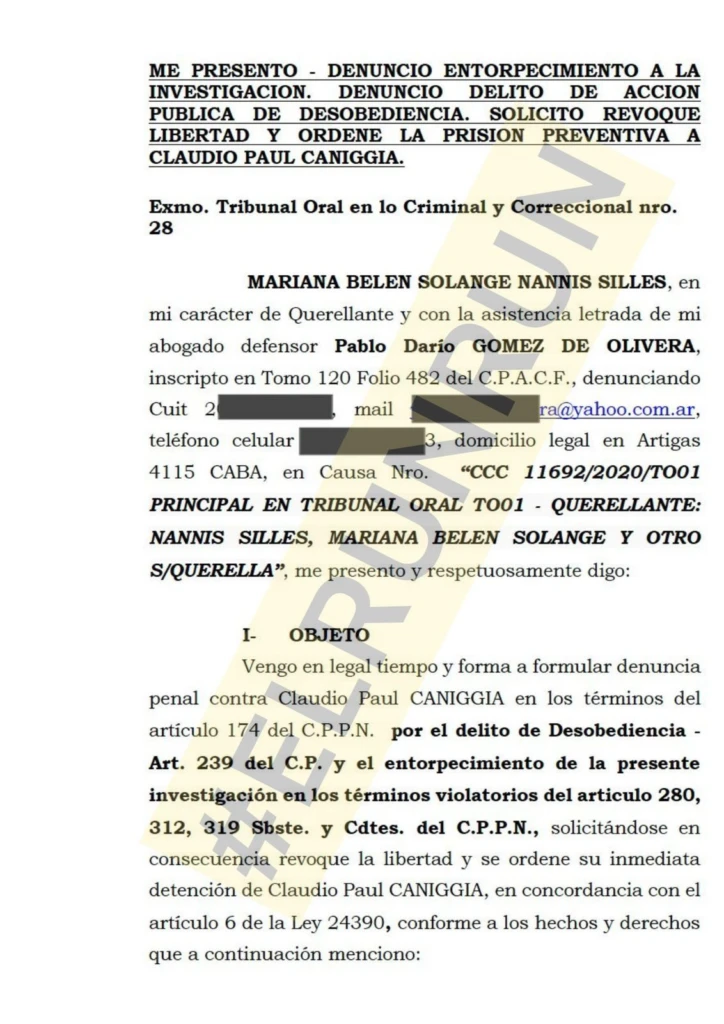 Dentro de la denuncia del supuesto abuso que Nannis afirma que sufrió por parte del papá de sus hijos, la cual está radicada en el Tribunal Oral N°28 , en los fundamentos que dieron para su detención alegaron que Claudio Paul incurrió en el delito de desobediencia y está entorpeciendo el avance de la investigación judicial.