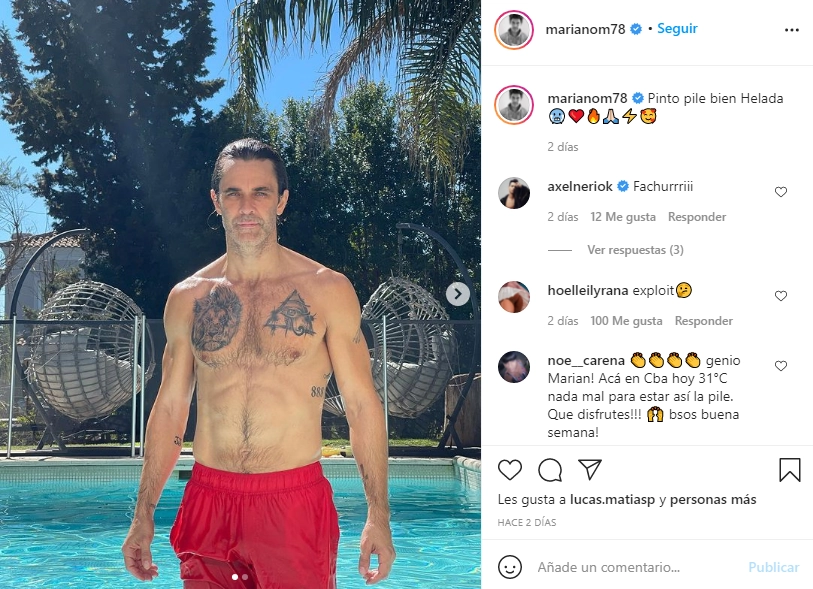 "Pinto pile bien helada”, expresó Mariano en su cuenta de Instagram, donde lo siguen mas de 2 millones de personas. Esta publicación consiste en una foto y un video, donde se lo ve luciendo un traje de baño rojo y dándose un chapuzón en un agua super helada. El posteo lleva cosechado más de 25 mil “me gusta” y recibió comentarios de todo tipo como “bellísimo”, “adoramos” y “caramba”.