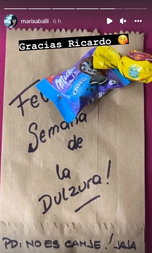 Además de contar las repercusiones de su canje cafetero, la intérprete de Clericó con cola y ex novia de Marcelo Tinelli compartió en sus historias los divertidos regalitos que recibió, como el de una persona que le mandó golosinas por la semana de la dulzura con una pícara postdata: “¡No es canje!”.