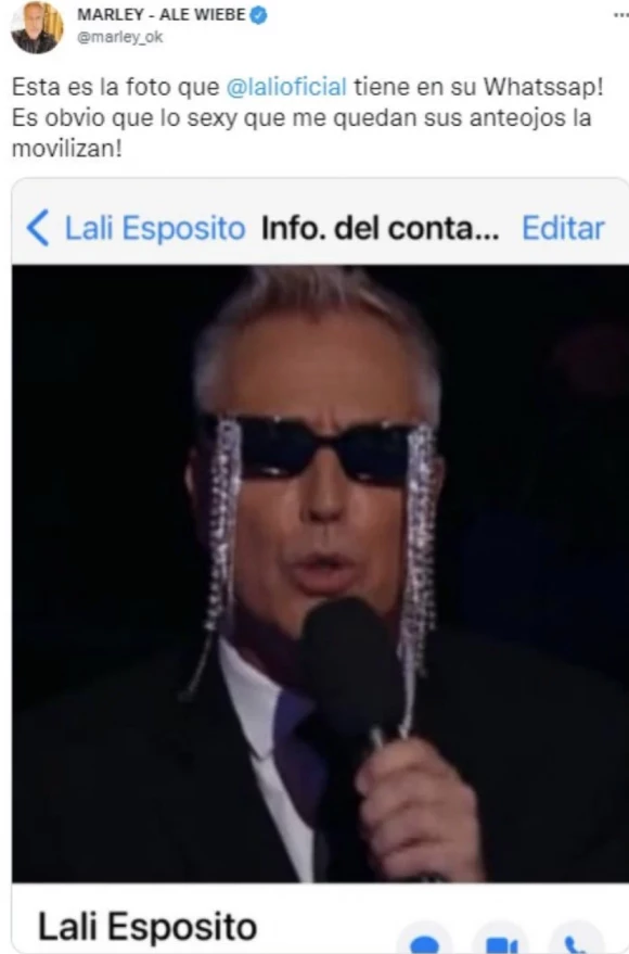 Lo extraño del caso reside en que la postal seleccionada es una pose de Marley, con unos anteojos que le prestó Lali y con una gestualidad del rostro singular. Así el animador tuiteó: "Esta es la foto que Lali tiene en su WhatsApp. Es obvio que lo sexy que me quedan sus anteojos la movilizan".