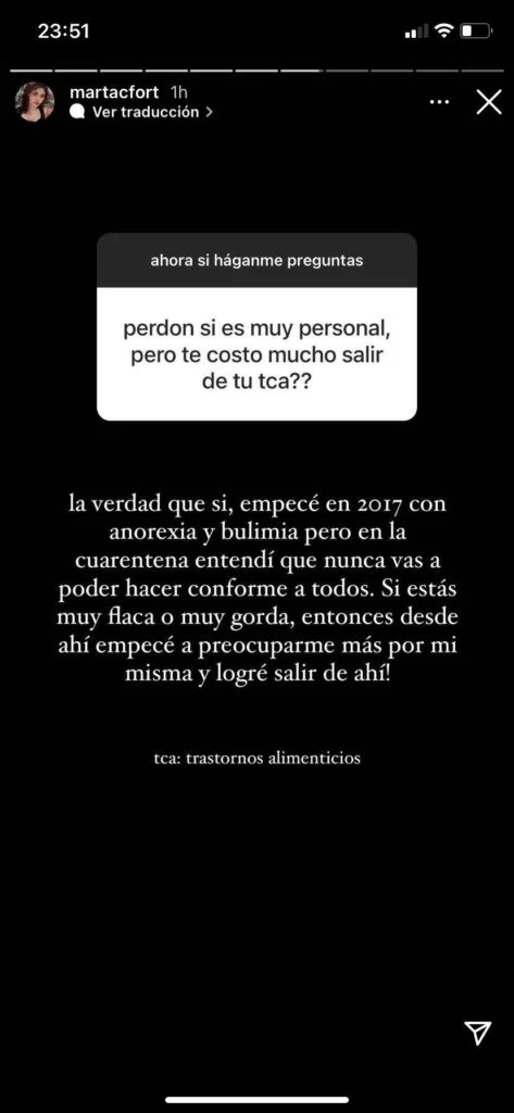 Y fue a través del juego de preguntas y respuestas de las redes sociales, ese que Marta suele hacer a menudo en instagram, donde eligió contestar algunas consultas de sus seguidores referidas a su identidad, su imagen… y sus trastornos alimenticios. “¿Te costó mucho salir de tu TCA?”, le preguntó un internauta.