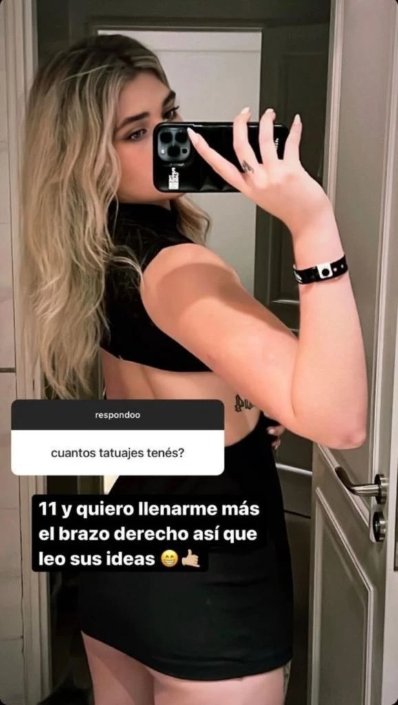 “Tengo 11. Quiero llenarme más el brazo derecho, así que leo sus ideas”, reveló y dejó abierta la posibilidad de que sus seguidores le den ideas para completar su brazo.