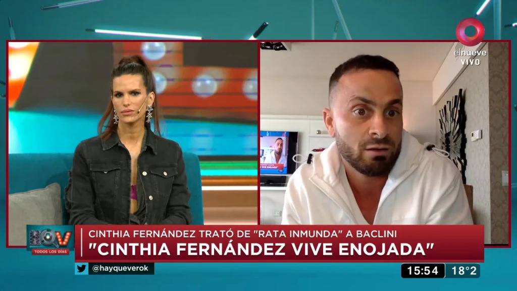 En una charla con el ciclo Hay que ver, Baclini decidió desahogarse y explicó que a pesar de haberse mantenido en el silencio, las provocaciones de su ex lo llevaron hasta el cansancio: “Hasta ahora, me llamé a silencio siempre. Fíjense que jamás critiqué a Cinthia. Sin embargo, si nos ponemos a ver la realidad, no hago nada, aparece una foto y me dice rata inmunda, cholulo, te detesto, te mato, te odio. ¡Es un montón!”.