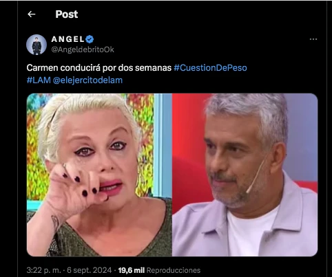 En definitiva, el hombre de América TV describió la elección de la gerencia del canal para suplantar a Massaccessi y posteó en su cuenta oficial: "Carmen Barbieri conducirá por dos semanas Cuestión de peso". Sí, la animadora de Mañanísima, que sale todos los días a la mañana en la pantalla, ocupará su lugar.