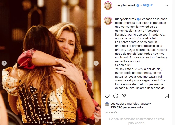 Atenta a las críticas, Mery decidió saltar a su Instagram para elaborar su descargo y reaccionar contra los cuestionamientos hirientes. “Pensaba en lo poco acostumbrada que están las personas a ver a famosos llorando, por lo que sea, impotencia, angustia, emoción o felicidad. Les parece raro o poco común entonces lo primero que sale es la crítica y juzgar al otro, es fácil hacerlo detrás de un teléfono, ¿todos nacimos cocinando?”, inició en un extenso mensaje.