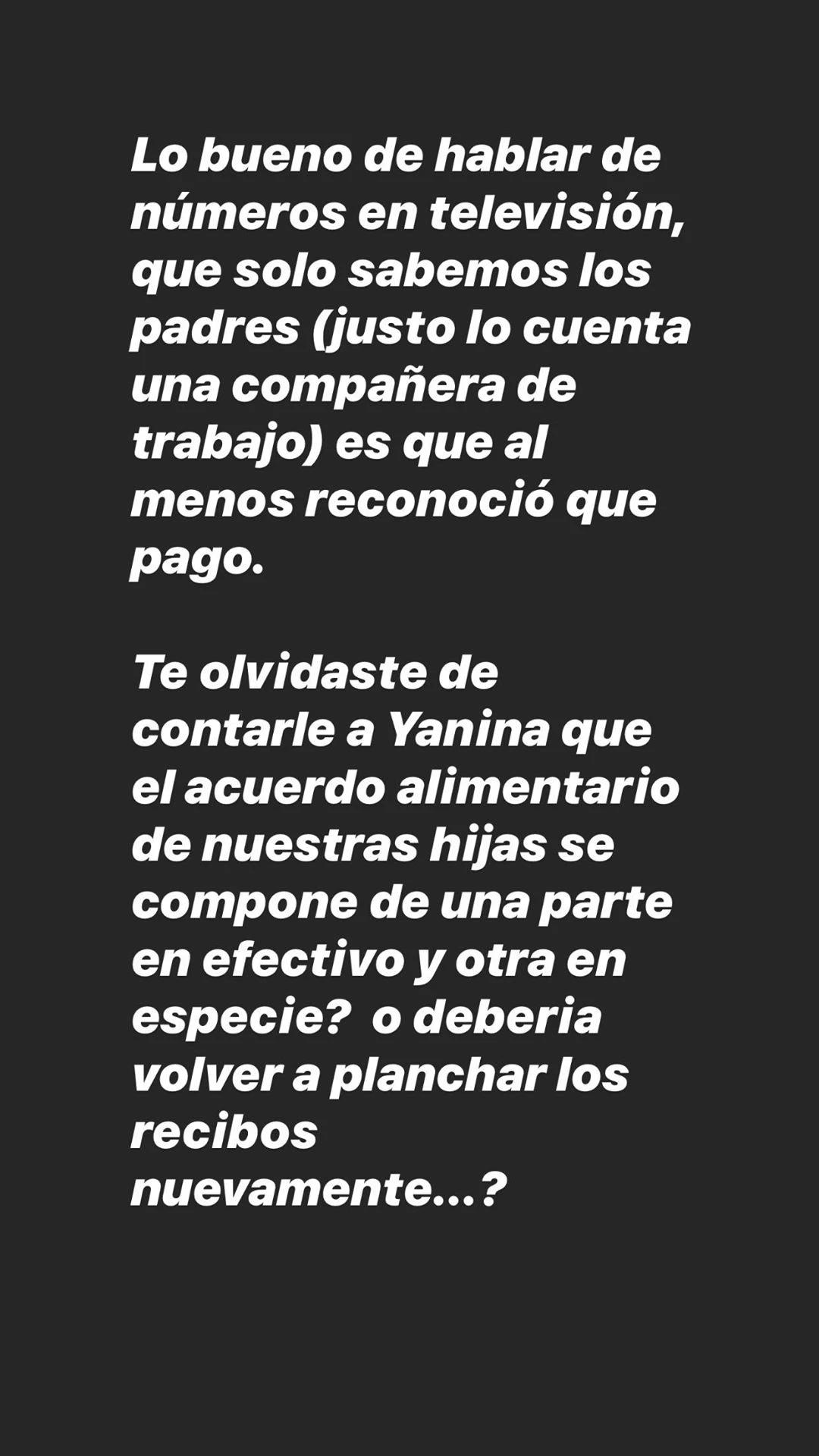 Y concluyó: “Te olvidaste de contarle a Yanina que el acuerdo alimentario de nuestras hijas se compone una parte en efectivo y la otra en especie? O debería volver a planchar los recibos, nuevamente?”.