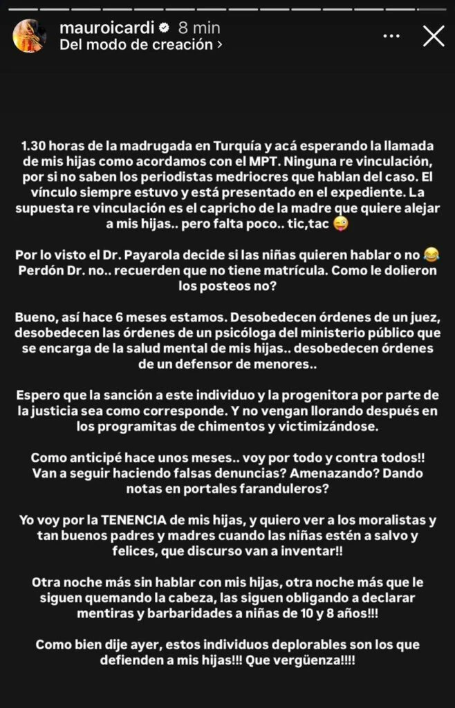 "1:30 hs de la madrugada en Turquía, esperando la llamada de mis hijas como acordamos con el MPT. Ninguna revinculación, por si no saben los periodistas mediocres que hablan del caso. El vínculo siempre estuvo y está presentado en el expediente. La supuesta revinculación es capricho de la madre que quiere alejarlas. Pero falta poco", comenzó.