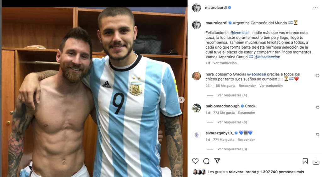 Mauro Icardi publicó un cariñoso mensaje dedicado al triunfo de la Selección Argentina en la final de la Copa del Mundo contra Francia. Y le expresó su cariño a Lionel Messi, reconociendo el largo camino de lucha y de perseverancia que tuvo el jugador hasta lograr su merecido objetivo.
