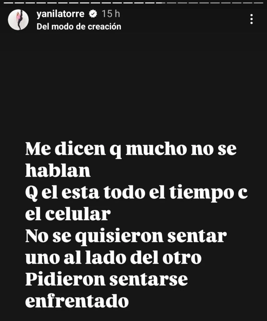 “Me dicen que mucho no se hablan. Que él está todo el tiempo con el celular. No se quisieron sentar uno al lado del otro. Pidieron sentarse enfrentados”, comenzó diciendo Latorre, quien no tuvo filtros a la hora de contar lo que pasa.