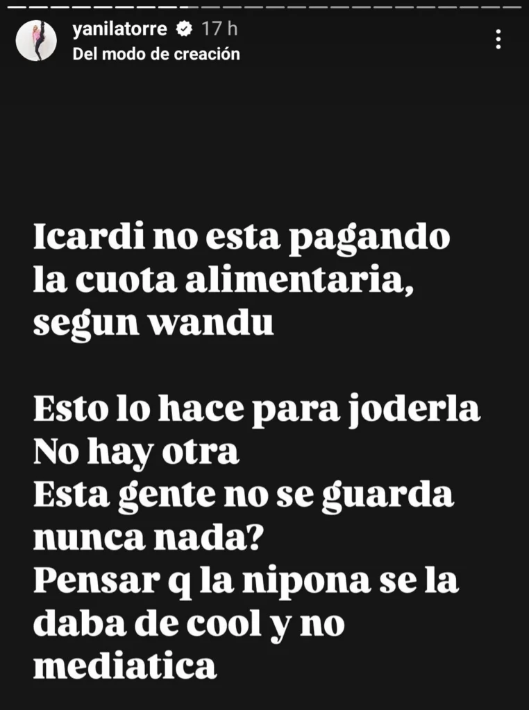 “Icardi no está pagando la cuota alimentaria, según Wandu. Esto lo hace para joderla. No hay otra ¿Esta gente no se guarda nunca nada? Pensar que la nipona se la daba de cool y no mediática”, sentenció la panelista de LAM.