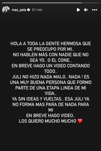 “Juli no hizo nada malo… NADA. Es muy buena persona que formó parte de una linda etapa de mi vida. Ya sin idas y vueltas, esa Juli ya no forma más parte de nada para mi”, comentó Maximiliano y sus seguidores quedaron sorprendidos con la últimas frase.