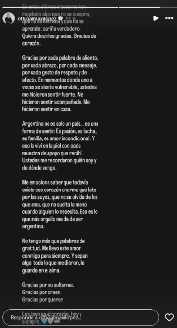 Luego Maxi describió lo que representa para él su país. “Es pasión, es lucha, es familia, es amor incondicional. Y eso lo viví en la piel con cada muestra de apoyo que recibí. Ustedes me recordaron quién soy y de dónde vengo”, escribió. Con esto reveló el fuerte vínculo con sus raíces y su sentido de pertenencia, algo que nunca se modificó a pesar de sus muchos años viviendo en el exterior.