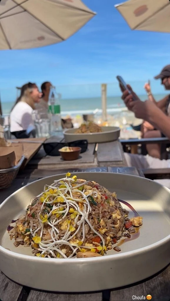 Las imágenes del restaurante playero mostraron platos frescos y veraniegos, como la ya clásica “choufa” que se convirtió en protagonista de una de las historias subidas a redes. La mesa de madera, los vasos helados y el mar de fondo completaron la postal perfecta del mediodía.