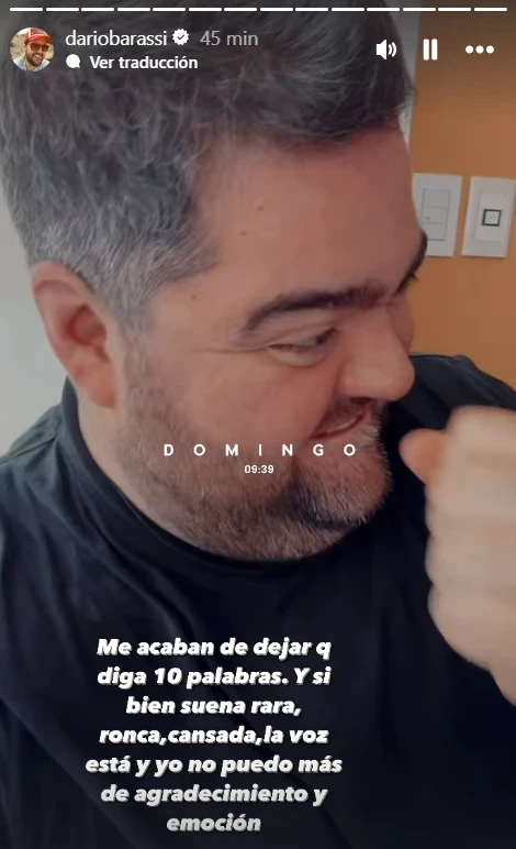 "Me acaban de dejar que diga 10 palabras. Y si bien suena rara, ronca, cansada, la voz está y yo no puedo más de agradecimiento y emoción", festejó Barassi en su video. Contando el día a día de su recuperación y cómo va, todo marcha en orden luego de este susto que se llevaron.
