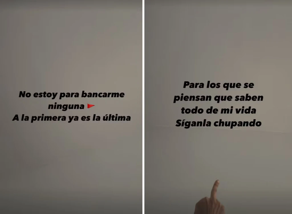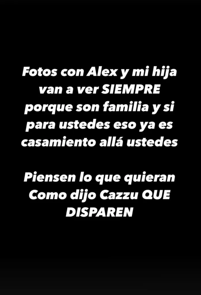 “Para los que se piensan que saben todo de mi vida, siganla chupando. Fotos con Alex y mi hija van a ver SIEMPRE porque son familia. Y si para ustedes eso ya es casamiento, allá ustedes. Piensen lo que quieran. Como dijo Cazzu: QUE DISPAREN”, finalizó.