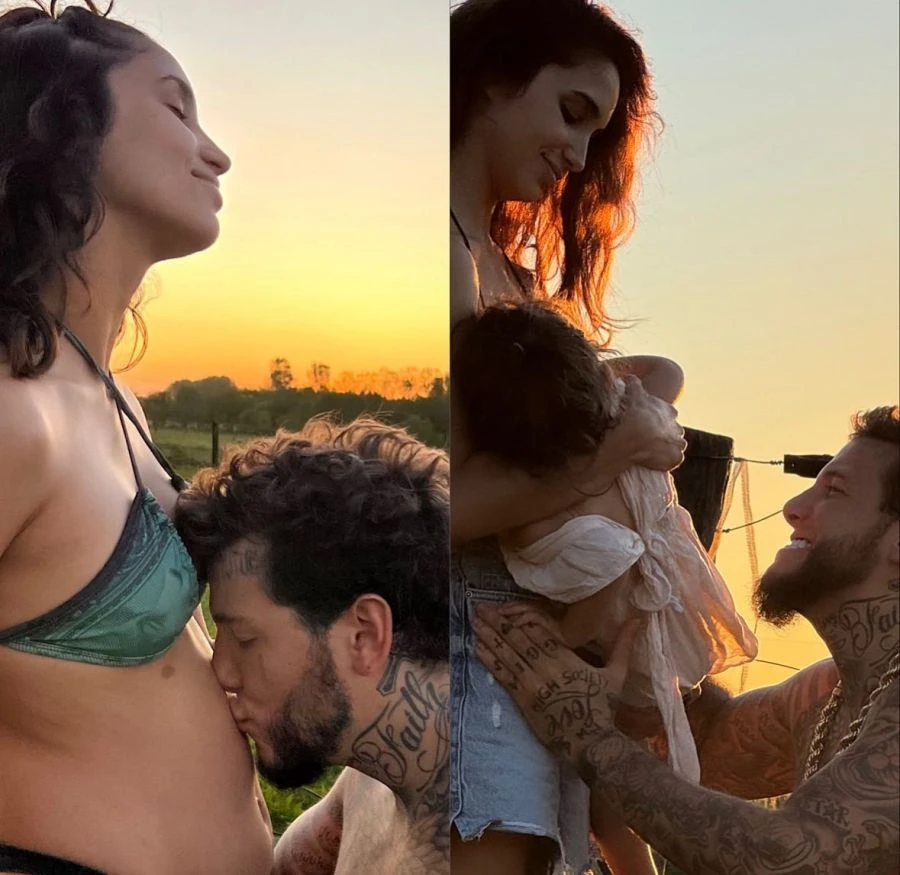 En otra publicación la nuera de Mariana Nannis hizo un tierno y divertido collage donde, con el mismo fondo y atardecer junto a Alex pretendieron replicar una foto de cuando estaba embarazada y la compararon con otra solo que en al segunda ya con Venezia en brazos.