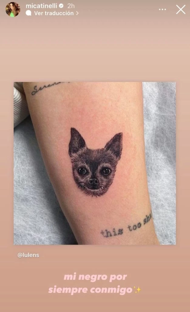A una semana de la muerte de la mascota, la empresaria textil pensó en inmortalizar a su perro y, tras elegir una foto de este, fue a un local de tatuajes para que se lo hagan en uno de sus brazos. Feliz con el trabajo terminado y por lo que para ella significaba, la hija de Tinelli manifestó: “Por siempre en mi y en mi piel”.