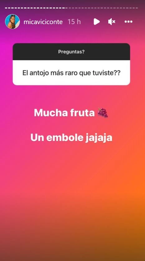 Y en las últimas horas, Mica mantuvo un fluido ida y vuelta con sus seguidores en el que contó muchas intimidades de su embarazo, detalles de estas 28 semanas que son una montaña rusa de emociones, hormonazos, alegría y… ¡antojos!