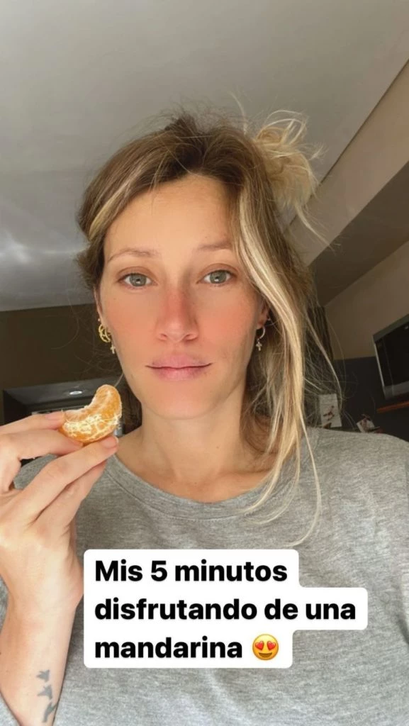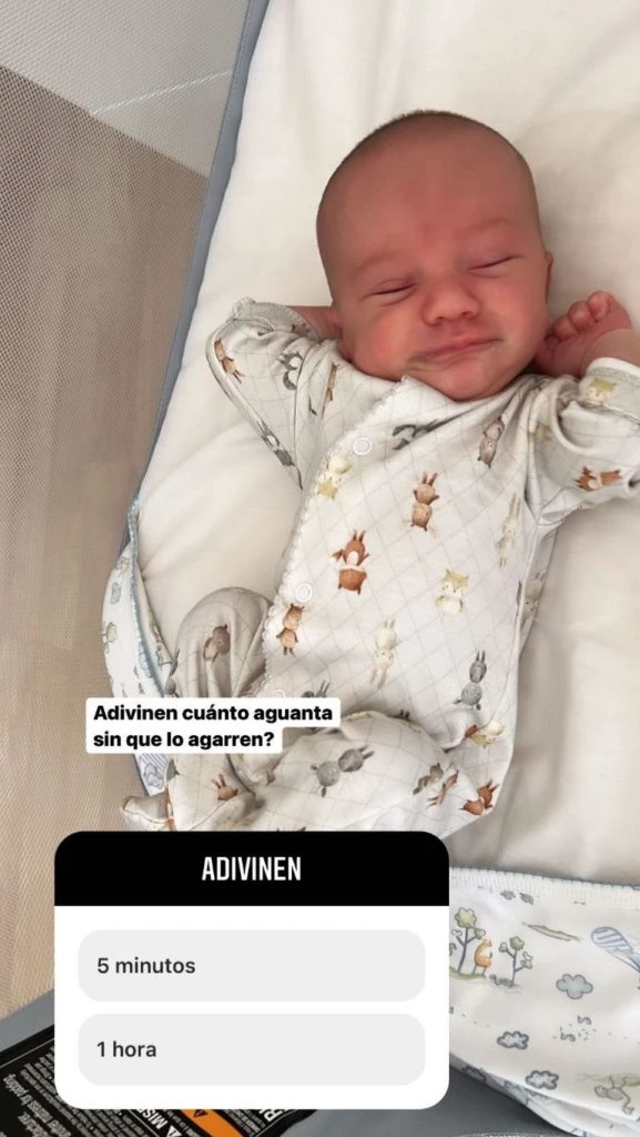 "¿Adivinen cuánto aguanta sin que lo agarren? ¿Cinco minutos o una hora?", escribió la flamante mamá encima de una postal en la que se lo ve al bebé recostado en su cuna. Posteriormente compartió una foto suya y señaló: "Mis cinco minutos disfrutando de una mandarina (y sumó un emoji de una carita con ojos de corazón)".