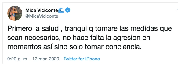 Con alto perfil de las redes sociales, no dejó pasar los comentarios de los haters que la criticaron por su viaje en medio de la pandemia por el coronavirus, y tuiteó: “Primero la salud, tranqui que tomaré las medidas que sean necesarias, no hace falta la agresión en momentos así sino solo tomar conciencia”.