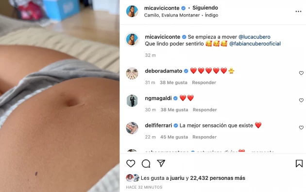 Mica Viciconte compartió un tierno video de Luca, el bebé que crece en su panza, dando sus primeras patiditas. Recostada y con buena parte de su cuerpo al descubierto, la pareja de Fabián Cubero compartió los primeros movimientos de la criatura que viene en camino.