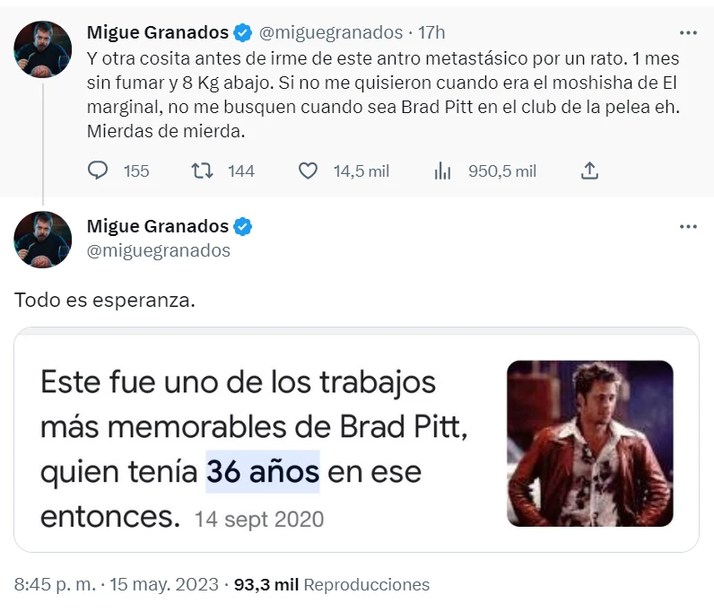“Y otra cosita antes de irme de este antro metastásico por un rato. Un mes sin fumar y 8 kilos abajo”, contó Migue. “ Si no me quisieron cuando era el moshisha de El Marginal, no me busquen cuando sea Brad Pitt en El Club de la Pelea, eh. Mierdas de mierda”, cerró.