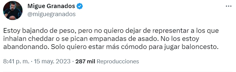 Y Migue se despidió de sus seguidores con una aclaración: “Estoy bajando de peso, pero no quiero dejar de representar a los que inhalan cheddar o se pican empanadas de asado. No los estoy abandonando. Solo quiero estar más cómodo para jugar baloncesto”.