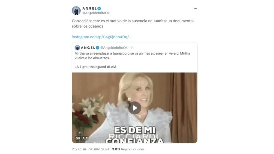 El encargado de dar la primicia sobre el regreso de Mirtha a los almuerzos fue Ángel de Brito. "Mirtha va a reemplazar a Juana porque se va un mes a pasear en velero, Mirtha vuelve a los almuerzos. La 1 @mirthalegrand", escribió el conductor de LAM en sus redes sociales.