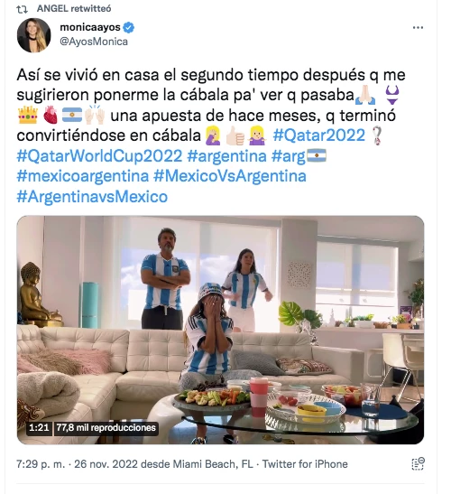 Los nervios dominaron la escena. La angustia se apoderó de millones de argentinos durante el duelo contra México por el Mundial de Qatar, por la necesidad imperiosa de obtener un triunfo para seguir con vida. Por eso se paralizó el país y también a aquellos que residen en el exterior, como el caso de Mónica Ayos.