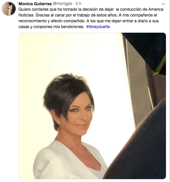 Pasadas las 7.30 am, Mónica escribió: “Quiero contarles que he tomado la decisión de dejar la conducción de América Noticias. Gracias al canal por el trabajo de estos años. A mis compañeros el reconocimiento y afecto compartido. A los que me dejan entrar a diario a sus casas y corazones mis bendiciones. #libreydueña”.