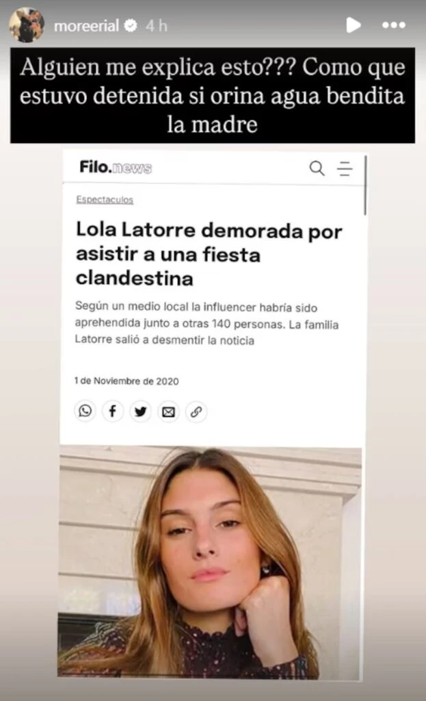 Desde sus historias, sin dar nombre pero dejando en claro que se refería a Lola Latorre, Morena posteó la captura de una noticia de noviembre de 2020 cuando estando en pandemia la modelo e influencer asistió a una fiesta clandestina y, sobre esta escribió: “¿Alguien me explica esto? Como que estuvo detenida si orina agua bendita como la madre”.