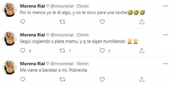 Y es que, en las últimas horas Morena ha publicado polémicos mensajes en su cuenta de Twitter insultando a una mujer misteriosa pero que al parecer no se banca. "Me viene a bardear a mí, pobrecita. Seguí cogiendo por plata, mamu. Y que te sigan humillando", escribió furiosa.