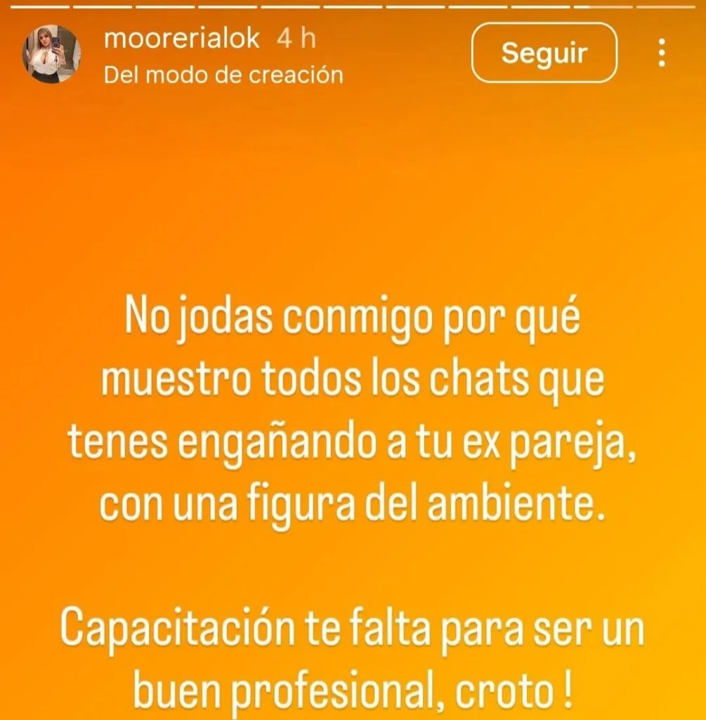 “No jodas conmigo porque muestro los chats que tenés engañando a tu ex pareja con una figura del ambiente. Capacitación te falta para ser buen profesional, croto!”, arremetió, sin filtros, More quien con su mensaje pretendió intimidar al muchachos en cuestión que viene teniendo enfrentamientos con su padre.