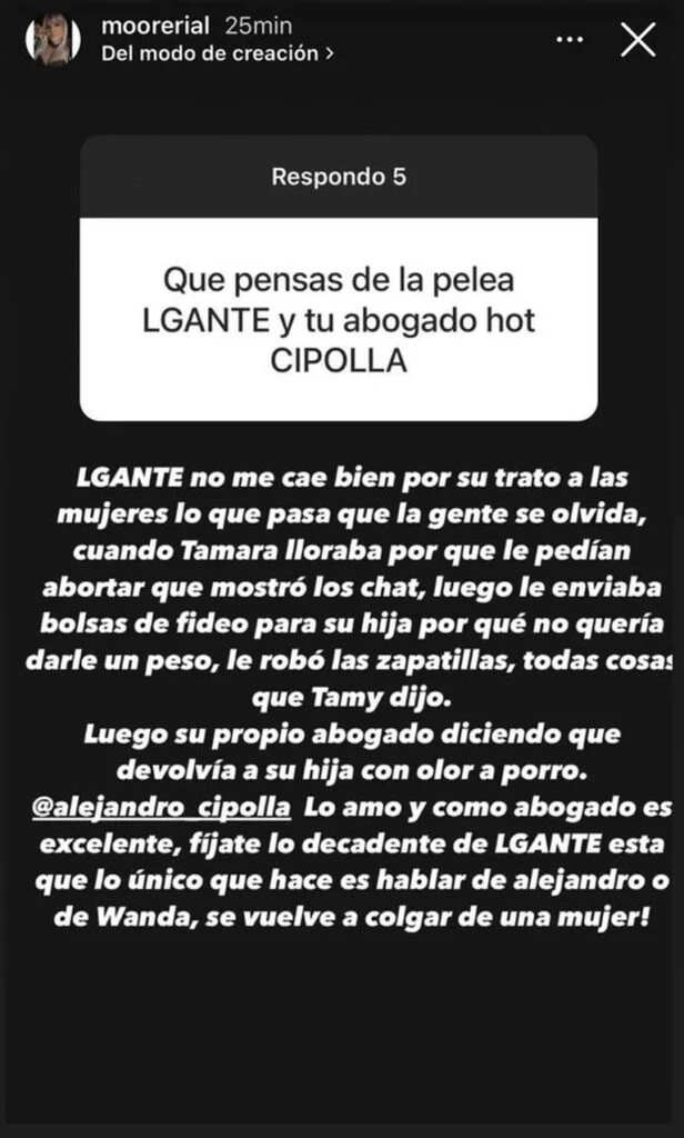 En sus clásicas respuestas de Instagram, Morena dejó en claro la mala imagen que tiene del cantante. "¿Qué opinas de L-gante?", le consultó un seguidor. Sin guardarse nada, la mediática sentenció: “L-Gante no me cae bien por su trato a las mujeres. Lo que pasa es que la gente se olvida cuando Tamara lloraba porque le pedían que abortara (que mostró los chats), luego le enviaba bolsas de fideos para su hija porque no quería darle un peso, le robó las zapatillas, todas cosas que Tamy dijo. Luego su abogado dijo que devolvía a su hija con olor a porro”.