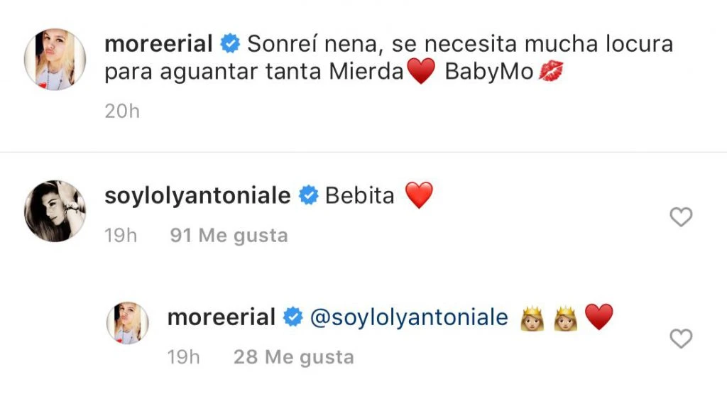 Loly Antoniale, ex pareja de Jorge pero muy allegada a Morena, le escribió en el posteo “Bebita” junto a un corazón, mensaje que la cantante respondió agradecida con emojis de corazones y el símbolo de una reina. Mientras que su papá le puso un like a la publicación y su hermana Rocío también, con quien estuvo distanciada un largo tiempo.