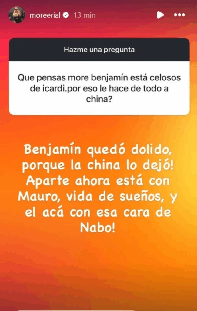 Un seguidor quiso saber qué opinaba Morena sobre la actitud del actor chileno y le preguntó: “Qué pensás More, ¿Benjamín Vicuña está celoso de Mauro Icardi, por eso le hace de todo a la China Suárez?”. La consulta no pasó desapercibida y ella aprovechó la oportunidad.