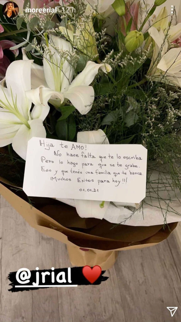 De hecho, el 1º de enero, cuando debutó, su papá, Jorge Rial la sorprendió con un enorme ramo de flores que le dejó en su camarín deseándole suerte. “¡Hija te amo! Ni hace falta que te lo escriba, pero lo hago para que se te grabe. Tenés una familia que te banca. ¡Muchos éxitos para hoy!”, decía la carta que el conductor le dejó a su hija.