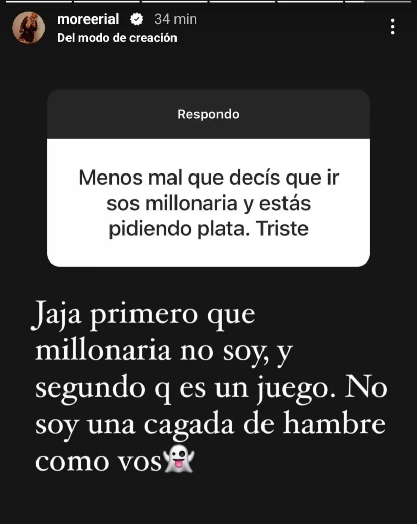 Morena Rial tiene una personalidad explosiva, no duda ni por un segundo en mandar a callar a alguien que la ataca. Recientemente la joven tuvo una pequeña discusión con uno de sus seguidores en Instagram, a quien trató como muerto de hambre.