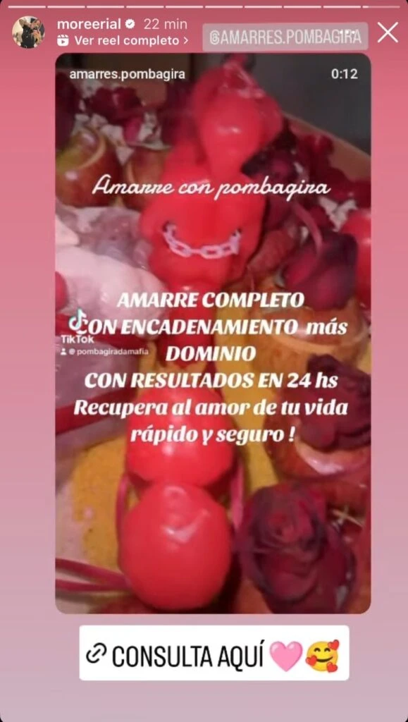 En la descripción del video que Morena compartió en su cuenta de Instagram, se puede leer detalles de este amarre. “Amarre con Pombagira. Amarre con encadenamiento más dominio con resultados en 24 horas. Recuperá el amor de tu vida, rápido y seguro”, sostiene.