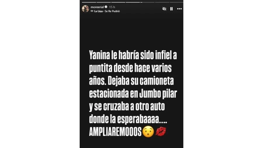 Mediante su cuenta de Instagram, Morena escribió una bomba: "Yanina le habría sido infiel a 'Puntita' desde hace varios años. Dejaba su camioneta estacionada en Jumbo Pilar y se cruzaba a otro auto donde la esperaba… AMPLIAREMOS".