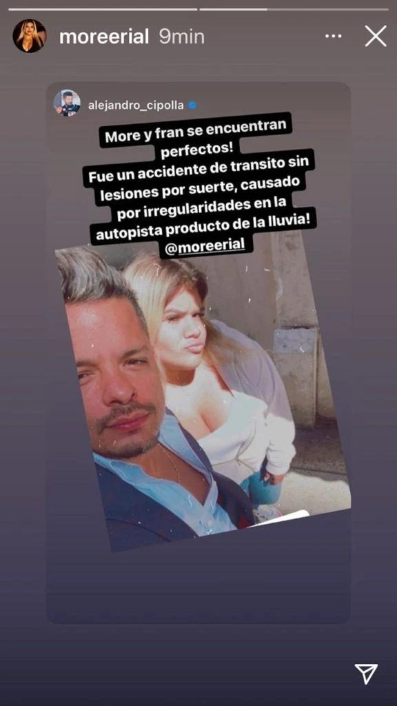 En él, el letrado confirmaba que el despiste de la camioneta se había producido por las condiciones climáticas que afectaron a la carretera: "More y Fran se encuentran perfectos. Fue un accidente de tránsito sin lesiones por suerte, causado por irregularidades en la autopista producto de la lluvia".