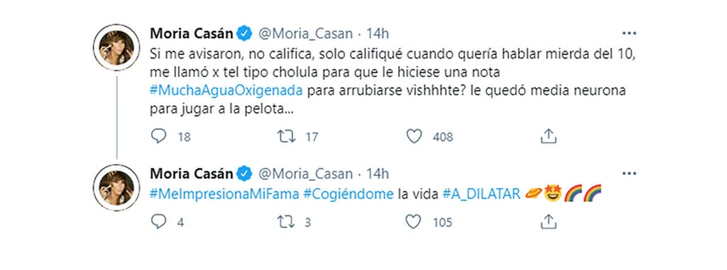 "Sí, me avisaron (de sus declaraciones). No califica, solo califiqué (sic) cuando quería hablar mier… del 10. Me llamó por teléfono tipo cholula para que le hiciese una nota #MuchaAguaOxigenada para arrubiarse, ¿vishhhte? Le quedó media neurona para jugar a la pelota...", escribió en Twitter la artista.