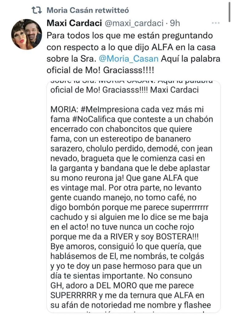 El domingo en la gala de eliminación de Gran Hermano se produjo en paralelo otro picante y polémico momento… pero a través de las redes sociales. Es que, luego de que se viera al aire un comentario de Alfa,… Moria Casan salió al cruce… y lo mató.