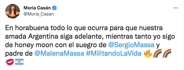 "Enhorabuena todo lo que ocurra para que nuestra amada Argentina siga adelante, mientras tanto yo sigo de honey moon con el suegro de Sergio Massa y padre de Malena Massa. Militando la vida", escribió Moria en su cuenta de Twitter, donde la siguen 3,1 millones de personas.