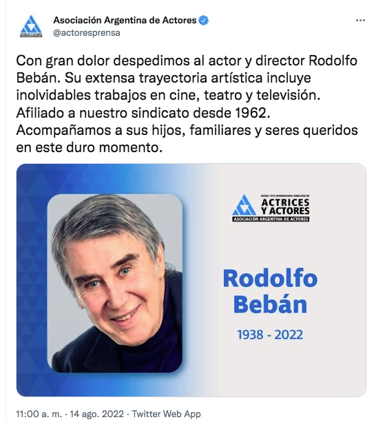 “Con gran dolor despedimos al actor y director Rodolfo Bebán. Su extensa trayectoria artística incluye inolvidables trabajos en cine, teatro y televisión. Afiliado a nuestro sindicato desde 1962. Acompañamos a sus hijos, familiares y seres queridos en este duro momento”, publicó la institución.