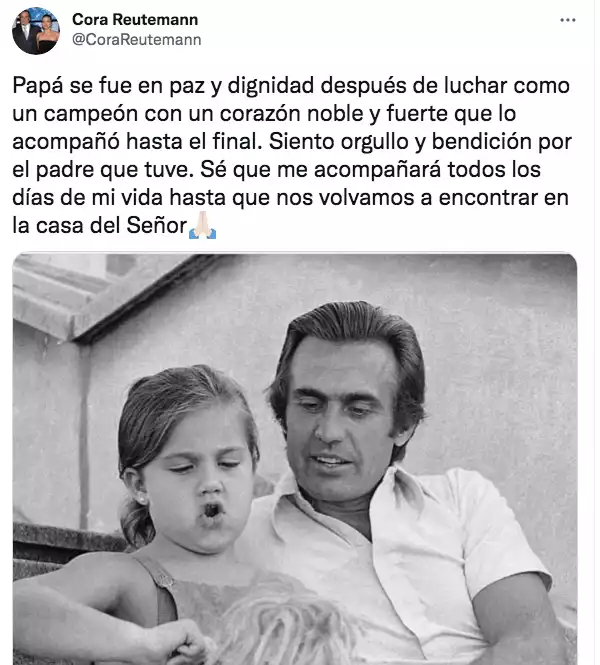 Tras haberlo desmentido ayer por la noche, su hija Cora Reutemann confirmó la triste noticia a través de su cuenta de twitter. "Papá se fue en paz y dignidad después de luchar como un campeón con un corazón noble y fuerte que lo acompañó hasta el final. Siento orgullo y bendición por el padre que tuve. Sé que me acompañara todos los días de mi vida hasta que nos volvamos a encontrar en la casa del señor", escribió en el mismo espacio donde había aclarado que "la seguía peleando".