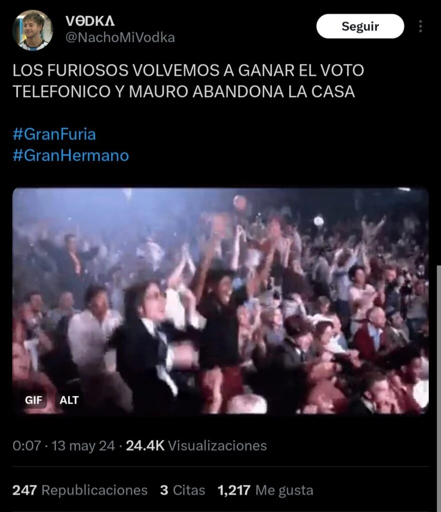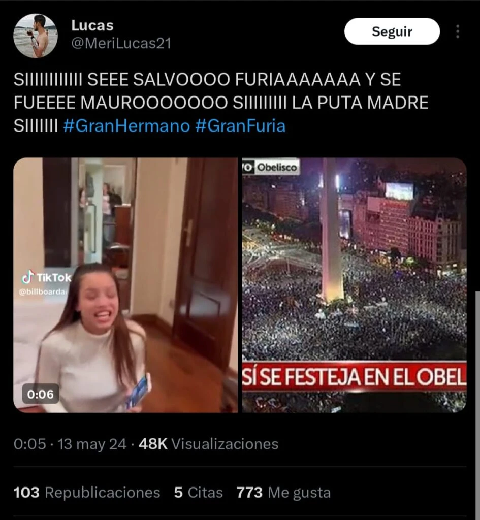 La réplica en las redes sociales posterior a la eliminación de Mauro fue instantánea y los fanáticos de la participante se expresaron con muchos memes luego de que terminó el programa y Furia siguen por lo menos una semana más dentro de la casa.