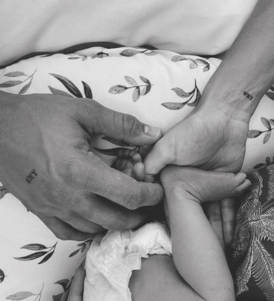En el carrosusell de fotos, de esta manera compartió las primeras imágenes del bebé. En las mismas se muestran partes del cuerpo, como las manos y los pies del bebé junto a las manos de sus padres Sara Escobar y Mau.